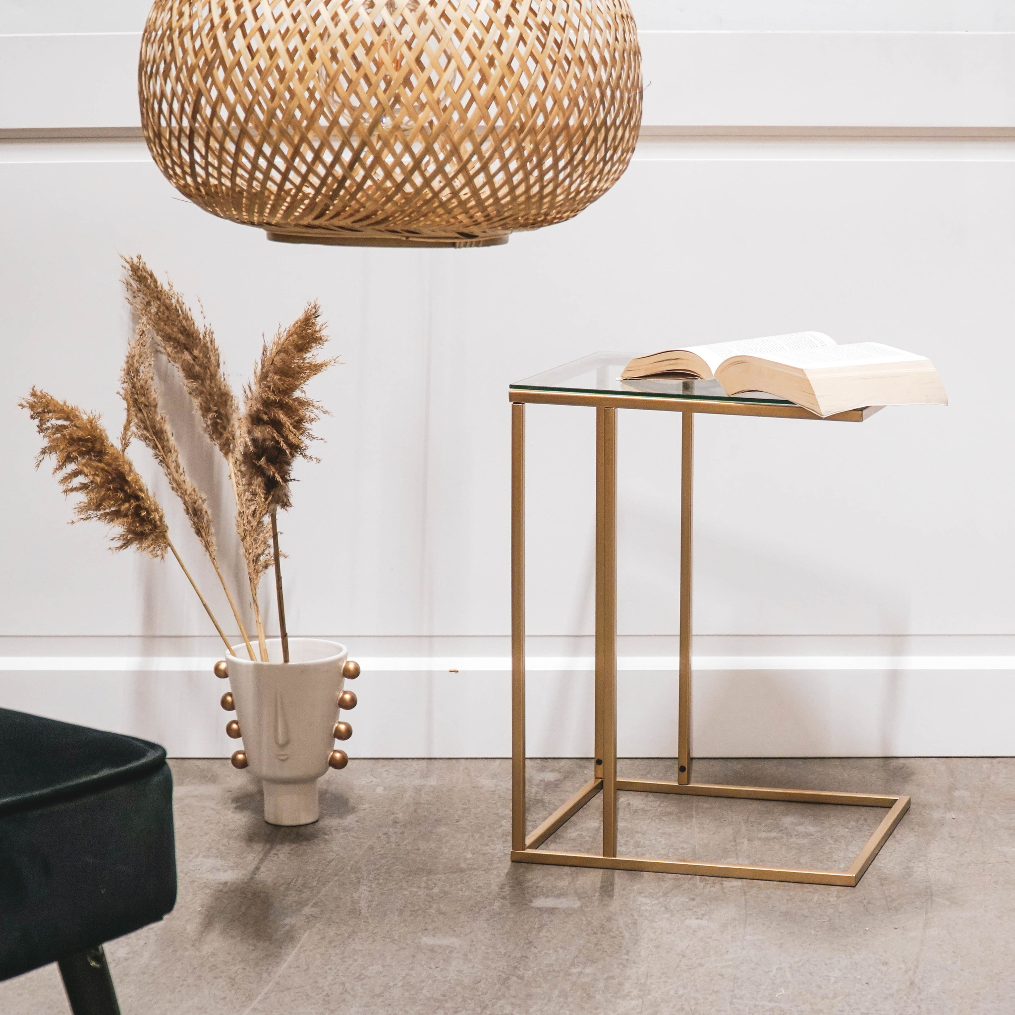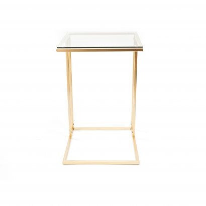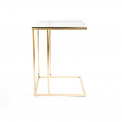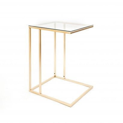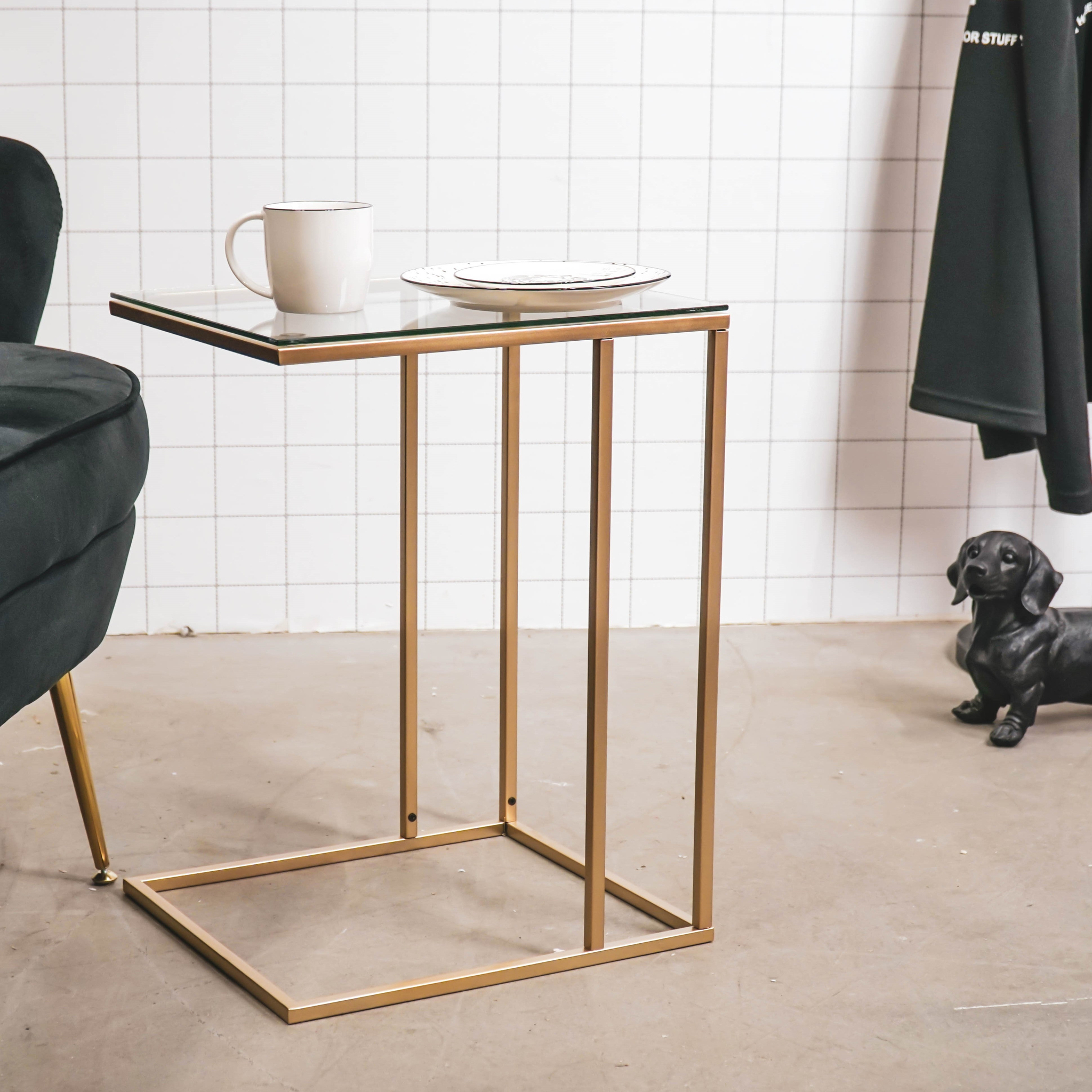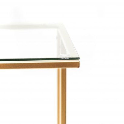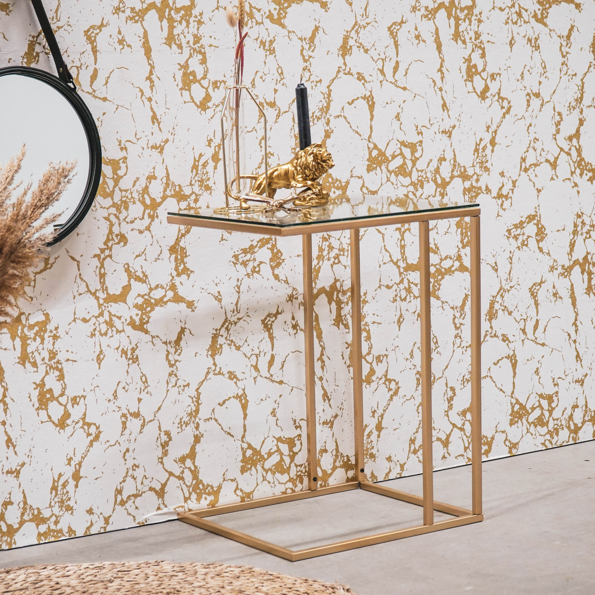 “Metal side table with glass – Versatile and chic, use it as a coffee or laptop table. Stylish gold design.”