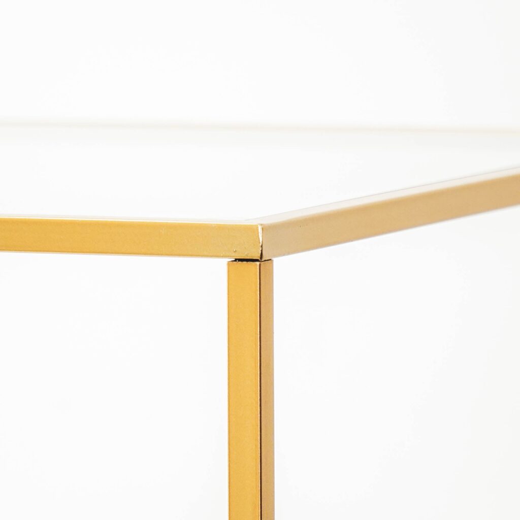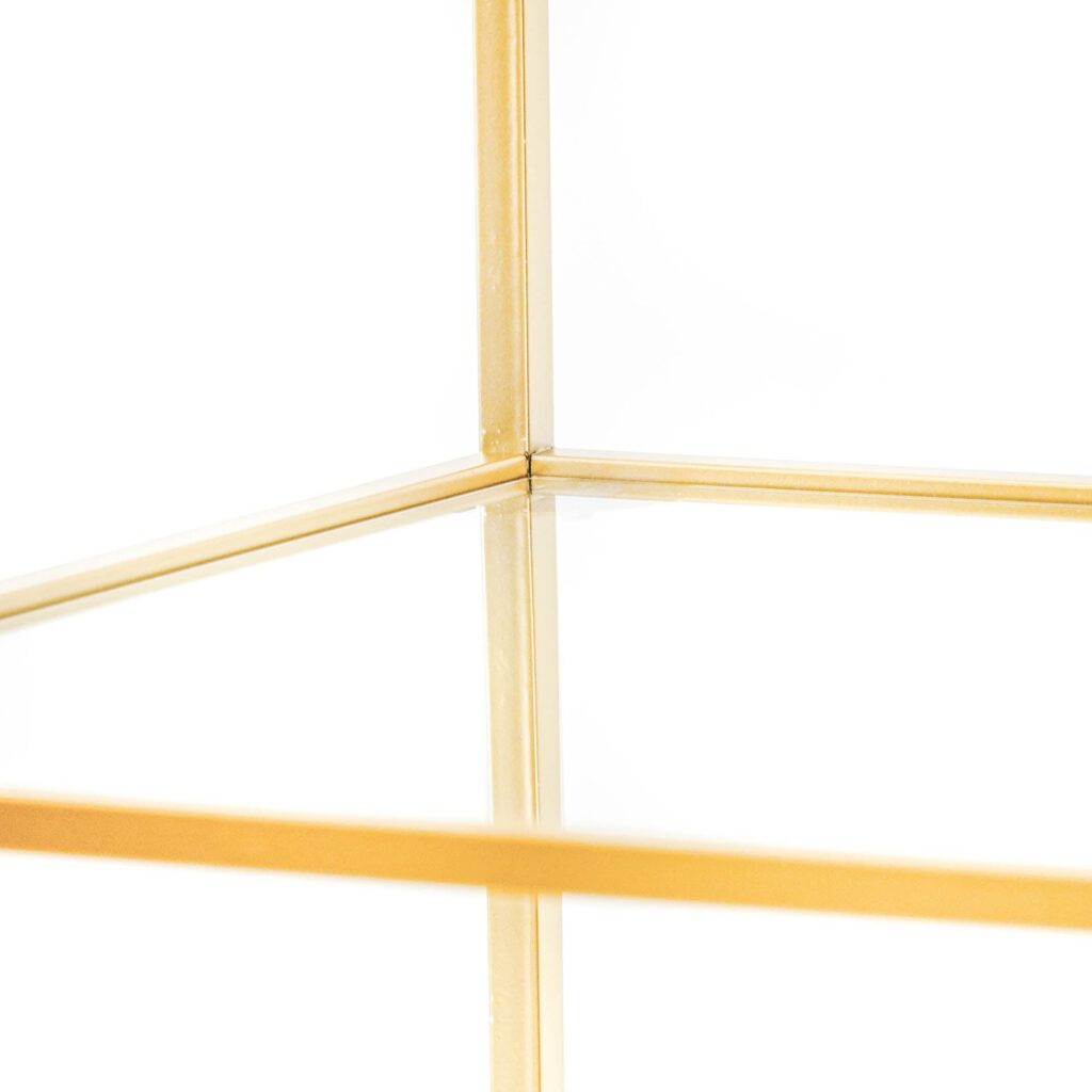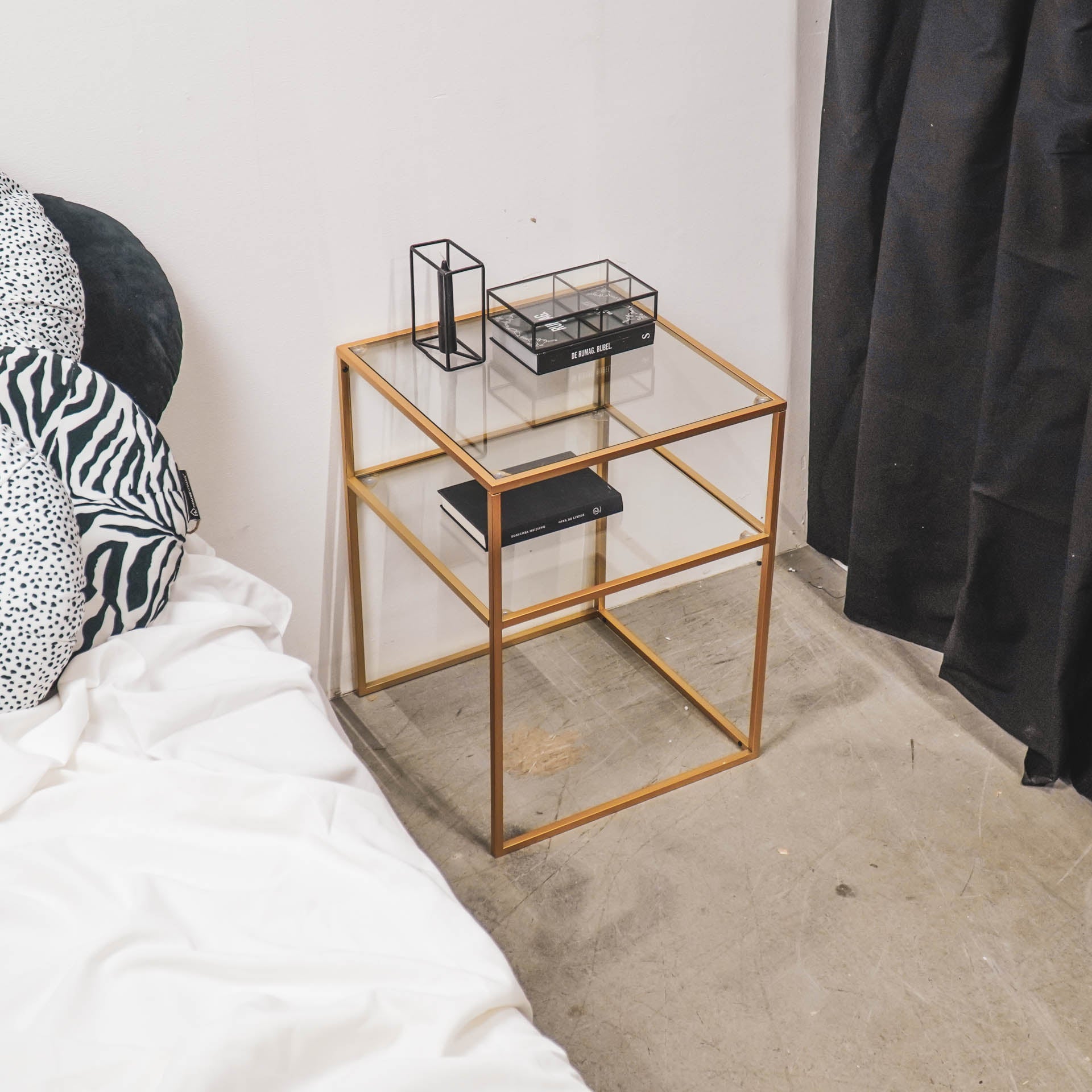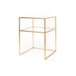 – MEUBELSTUK – Geschikt voor mixen en matchen. Zwarte metalen bijzettafel van Housevitamin. Gemaakt van metaal en glas, 45x45x60CM. Onderstel voor tijdschriften. Kleur: Goud.(Material: Metaal, Glas)