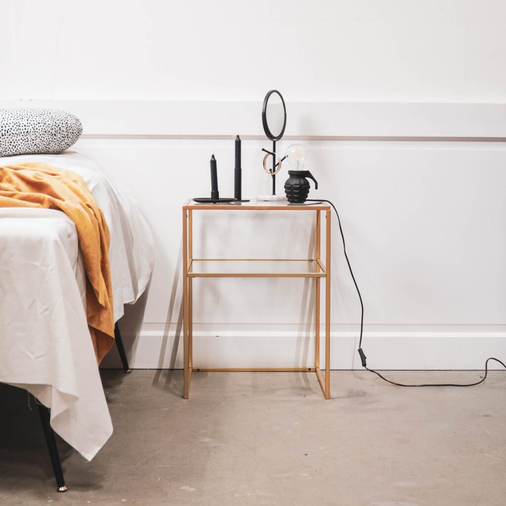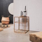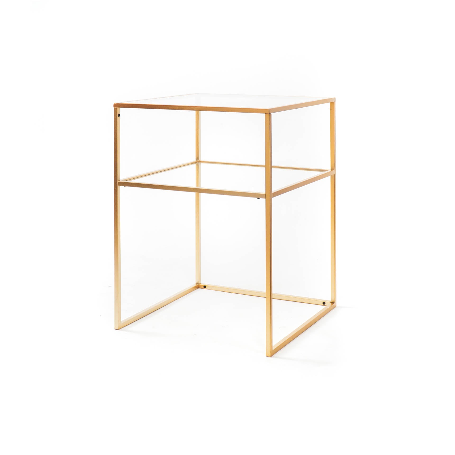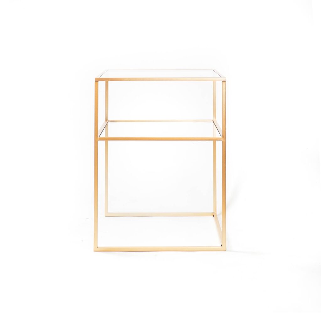 – MEUBELSTUK – Geschikt voor mixen en matchen. Zwarte metalen bijzettafel van Housevitamin. Gemaakt van metaal en glas, 45x45x60CM. Onderstel voor tijdschriften. Kleur: Goud.(Material: Metaal, Glas)