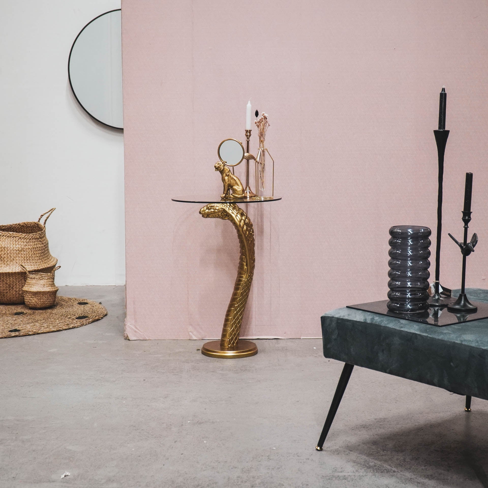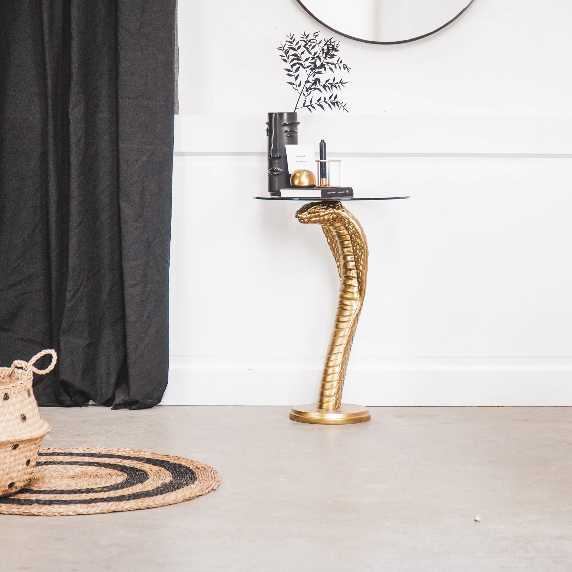 “Snakepit – Let him stylishly hold your drinks. Made of polyresin, 70x50cm. Doubles as a sidetable or showcase. Color: Gold.”
