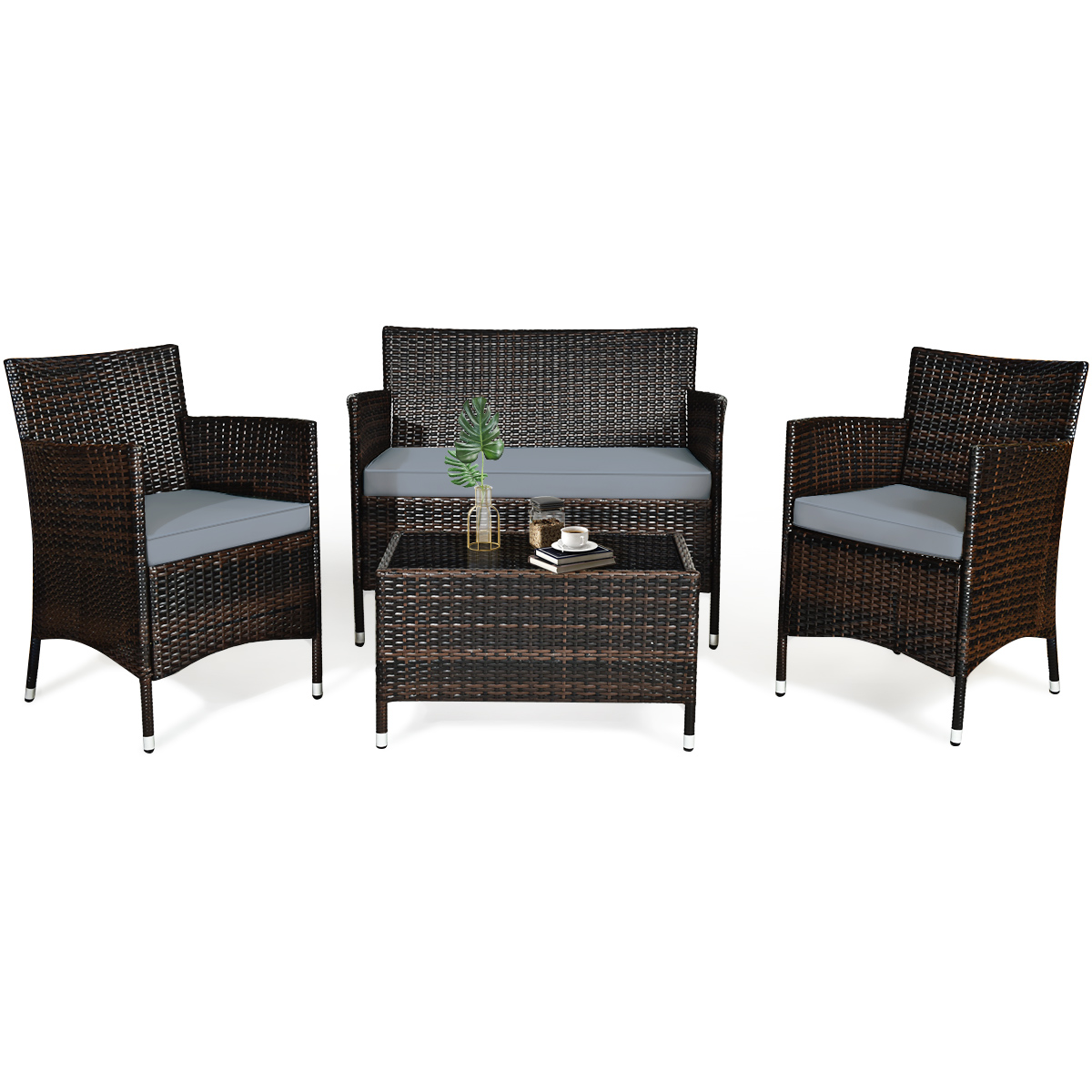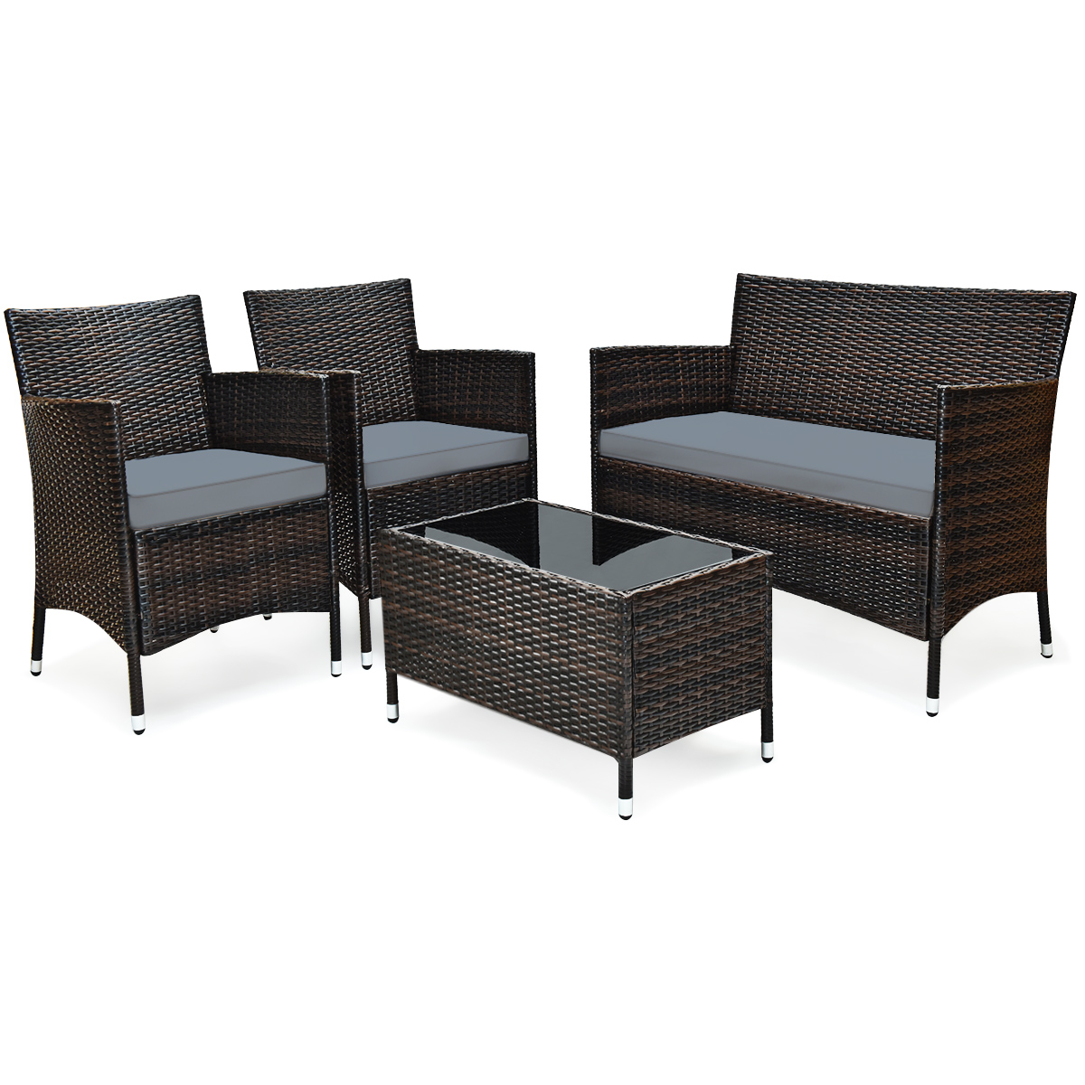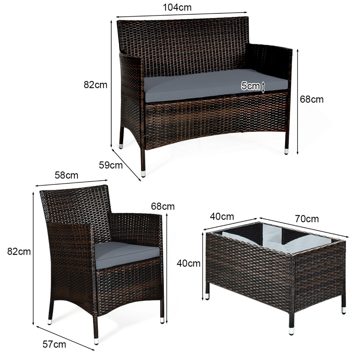 Onze 4-delige rotan bank set zal u de meest comfortabele ontspannen ervaring! Gemaakt van stevig stalen frame, de set is duurzaam genoeg om uw lange termijn keuze te zijn. Exquisite rotan met sterke taaiheid zal ook geven u een goede touch. Het zachte spons kussen kan ook helpen om uw lichaam volledig te ontspannen. Deze rieten tuinmeubelen set past bij elke huisstijl, het is een goede keuze voor woonkamers, veranda’s, zwembad of tuinen. Attributen: 【Stalen frame & Hand-geweven rotan】Gebouwd van hoge kwaliteit stalen frame, deze tafel en bank set is zeer stevig en duurzaam voor een lange levensduur. Het is niet gemakkelijk te vervormen en schudden. Bovendien is de stalen buis bedekt met handgeweven rotan, dat zich aanpast aan alle soorten weersomstandigheden. 【Multifunctioneel gebruik】De buiten meubelset beschikt over 2 enkele stoelen, 1 loveseat en 1 salontafel, die vrij kunnen worden gecombineerd op basis van verschillende gelegenheden. Het is ideaal voor uw eetkamer, patio, balkon, tuin, binnenplaats of bij het zwembad, het aanbieden van de vreugdevolle en prachtige vrije tijd. 【Stijlvolle glazen salontafel】De verfijnde rechthoekige tafel is de perfecte aanvulling op de bankcombinatie. Het tafelblad van gehard glas is dik en gemakkelijk schoon te maken. Het ruime tafeloppervlak maakt het gemakkelijk om drankjes, fruit en desserts te plaatsen om uw vrienden te vermaken. 【Ergonomische zitting met kussen】Deze rotan stoelen zijn ontworpen met gebogen leuningen en rugleuningen, die zich perfect naar uw rug en armen voegen voor maximale ontspanning. Bovendien is het kussen met rits gemakkelijk schoon te maken. En het is gevuld met dikke spons om u het ultieme comfort te bieden. 【Premium stabiele constructie】De afmeting van enkele bank is 58 x 57 x 82cm, terwijl de loveseat 104 x 59 x 82 cm is. En 70 x 40 cm tafel creëert een vrije ruimte. Deze rotan set houdt stabiel vermogen tot 320 kg (dubbele bank), 160 kg (enkele bank) en 30 kg (salontafel). Kenmerken: Gemaakt van rotan met goede taaiheid en weerbestendige functie Versterkt stalen frame met een uitstekende stabiliteit Zitkussens voor een zacht en comfortabel zitgevoel Salontafel met gehard glas voor sterke ondersteuning Sectionele bank voor het herschikken in verschillende combinaties Ergonomische rugleuning en leuning voor ultieme ontspanning Brede bank om te liggen, te spelen en te vergaderen Antislip poten om uw vloer te beschermen tegen krassen Stijlvol en elegant ontwerp voor gebruik binnen en buiten Ideaal voor plaatsing in patio, veranda, bij het zwembad of in de tuin Gemakkelijk schoon te maken en te onderhouden met een stofdoek Kussen met rits voor gemakkelijk schoonmaken Gemakkelijk in elkaar te zetten