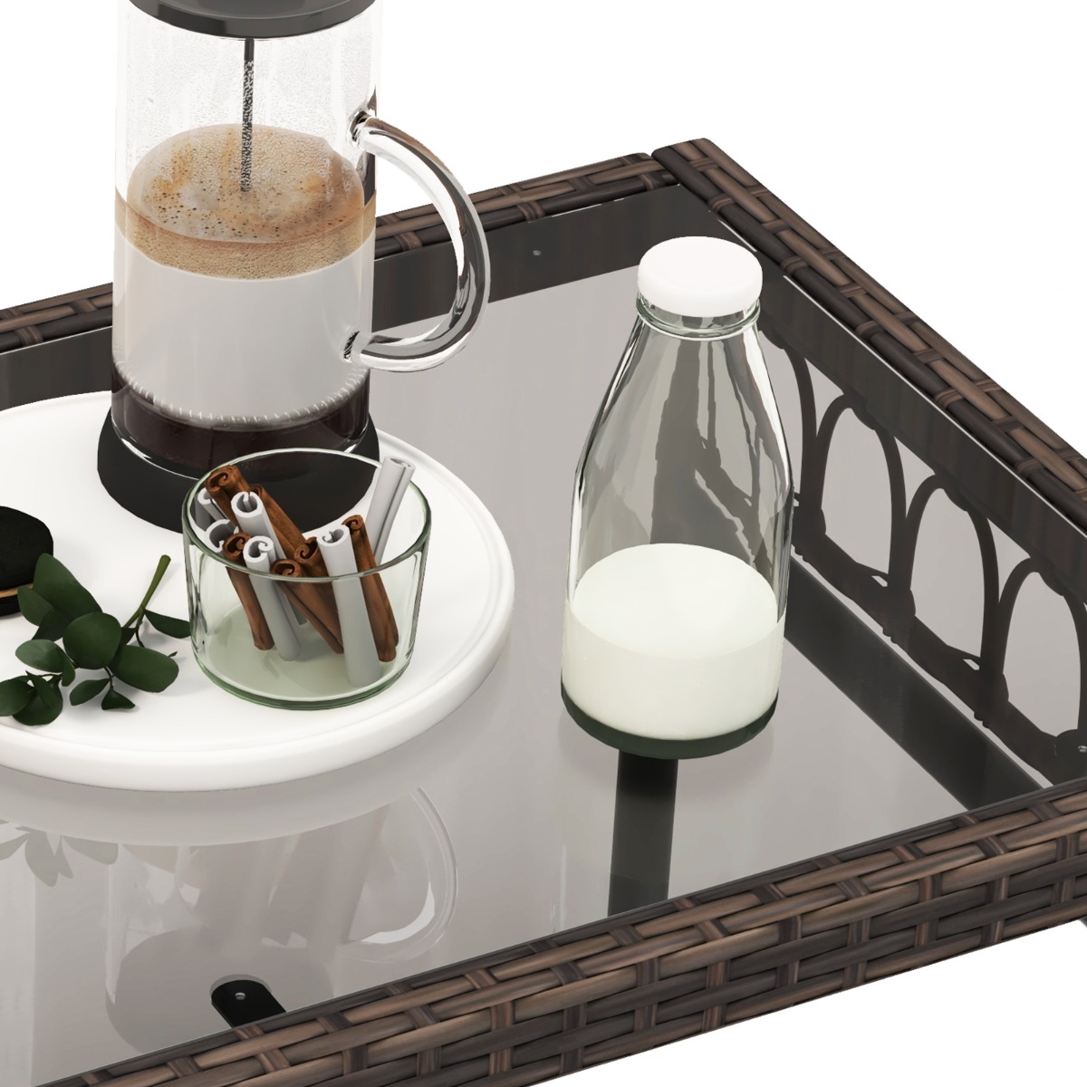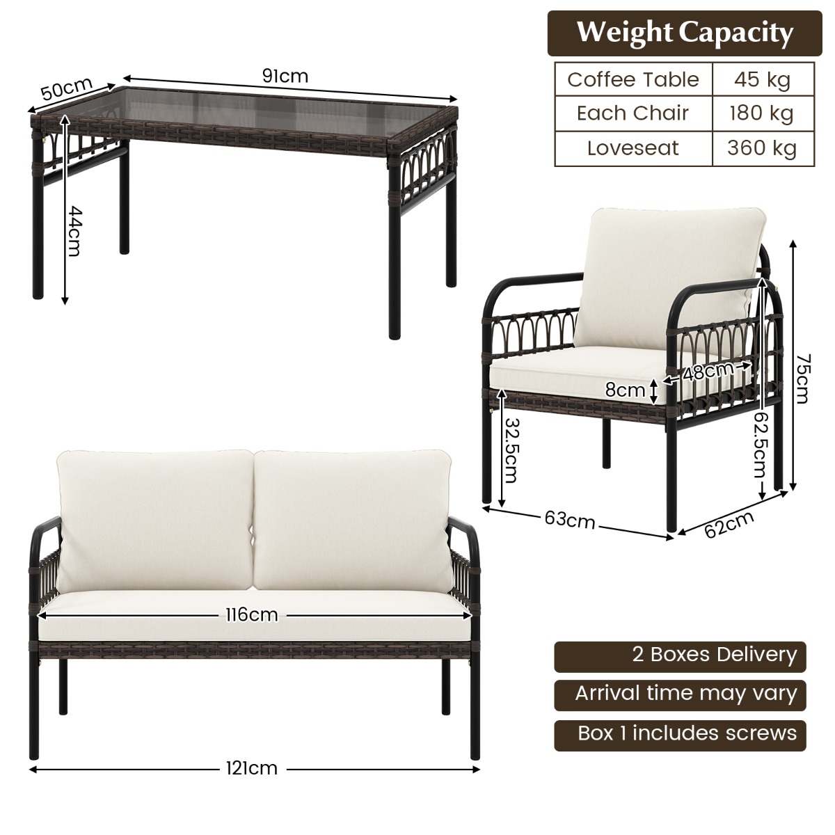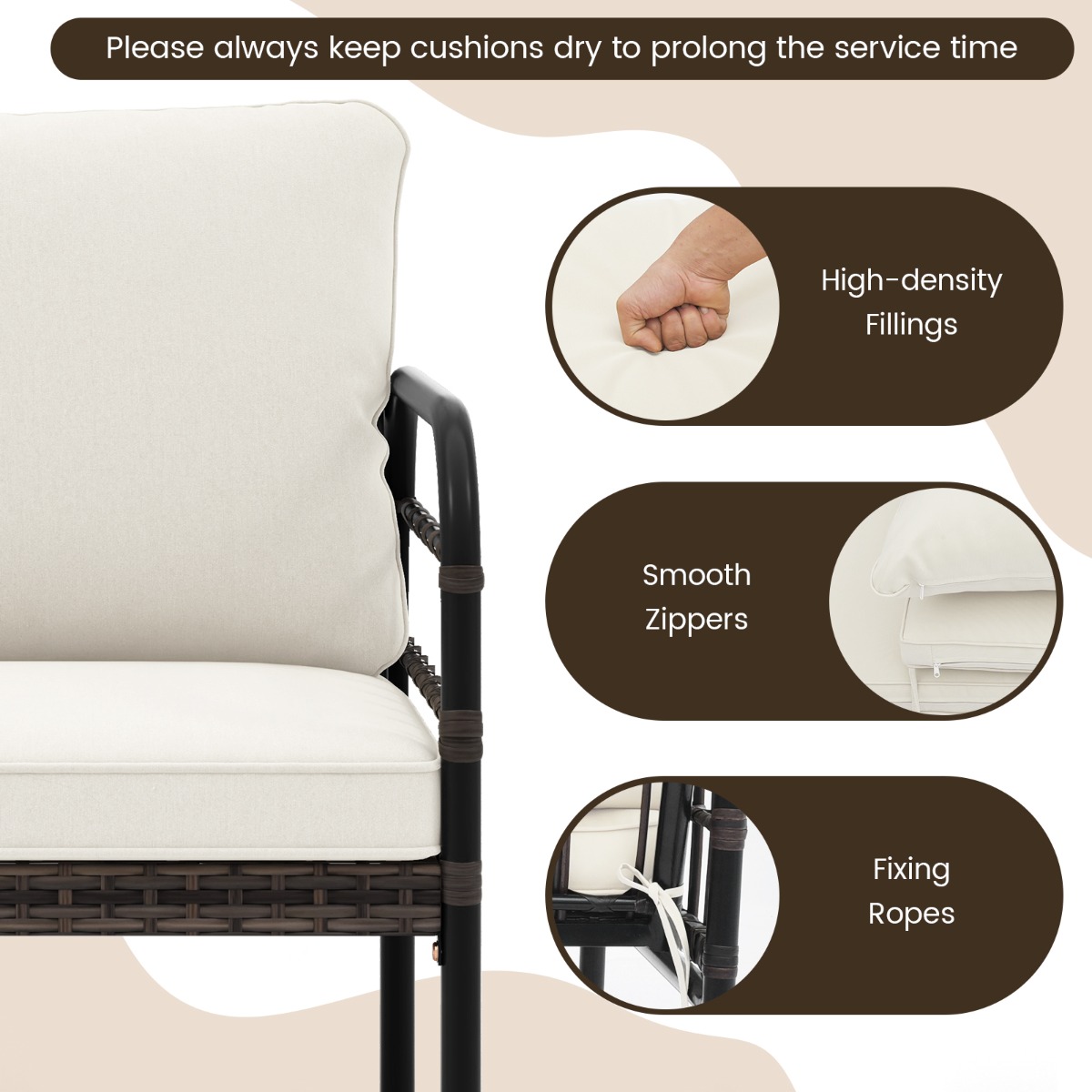 Deze bistroset bestaat uit 1 dubbele stoel, 1 salontafel en 2 stoelen en je kunt ze zo opstellen dat ze bij je beschikbare ruimte passen. De zachte kussens zorgen voor een comfortabele zitervaring en de salontafel van gehard glas houdt spullen binnen handbereik. Attributen: 【Geboren voor het buitenleven】: Zonwerend, kleurvast PE rotan en een stevig, roestbestendig metalen frame geven deze terrasmeubelset verbeterde prestaties buitenshuis, waardoor duurzaamheid en een lange levensduur verzekerd zijn. 【Om je comfortabeler te voelen】: Met een hoge dichtheid vulling en ontworpen met verstelbare rugleuningen, deze gestoffeerde fauteuils en dubbele stoelen creëren een comfortabele buiten zithoek voor vergaderingen. Houd kussens altijd droog om de levensduur te verlengen. 【Flexibele combinatie】: 1 salontafel (91 x 50 x 44 cm), 1 dubbele stoel (121 x 62 x 75 cm) en 2 fauteuils (63 x 62 x 75 cm) zorgen ervoor dat je dit buitenmeubilair in elke configuratie kunt opstellen die bij jouw ruimte past. 【Rechthoekige koffietafel】: Of je nu ’s ochtends geniet van een kopje koffie of een cocktailparty geeft, deze tafel van gehard glas biedt een mooi oppervlak voor je drankjes en hapjes. 【Onderhoudsvriendelijk】: Gehard glas van hoge kwaliteit maakt schoonmaken eenvoudig. En als je de kussenhoezen wilt wassen, hoef je ze alleen maar te openen en te verwijderen om ze gemakkelijk schoon te maken. Kenmerken: Handgeweven PE-vlechtwerk voor weerstand tegen verkleuren Robuust, roestbestendig metalen frame voor extra duurzaamheid Stabielere terrasmeubelset dankzij stevige constructie Antislip glijders voor extra stabiliteit Gehard glas van hoge kwaliteit Afneembare en wasbare kussenhoezen met gladde ritsen Houd kussens altijd droog voor een langere levensduur