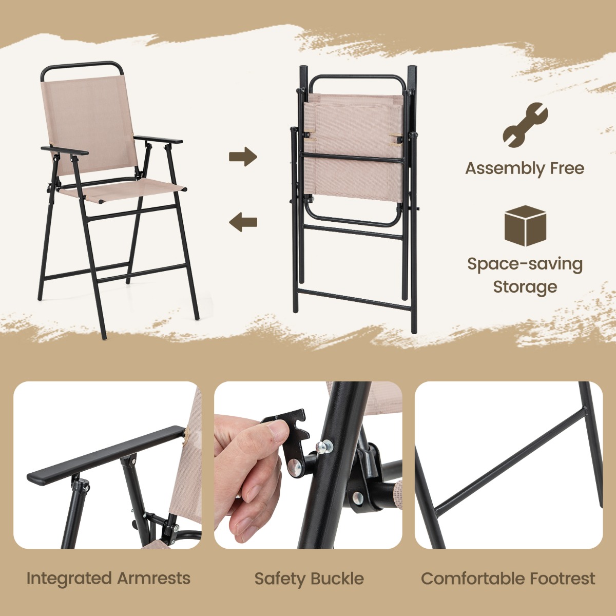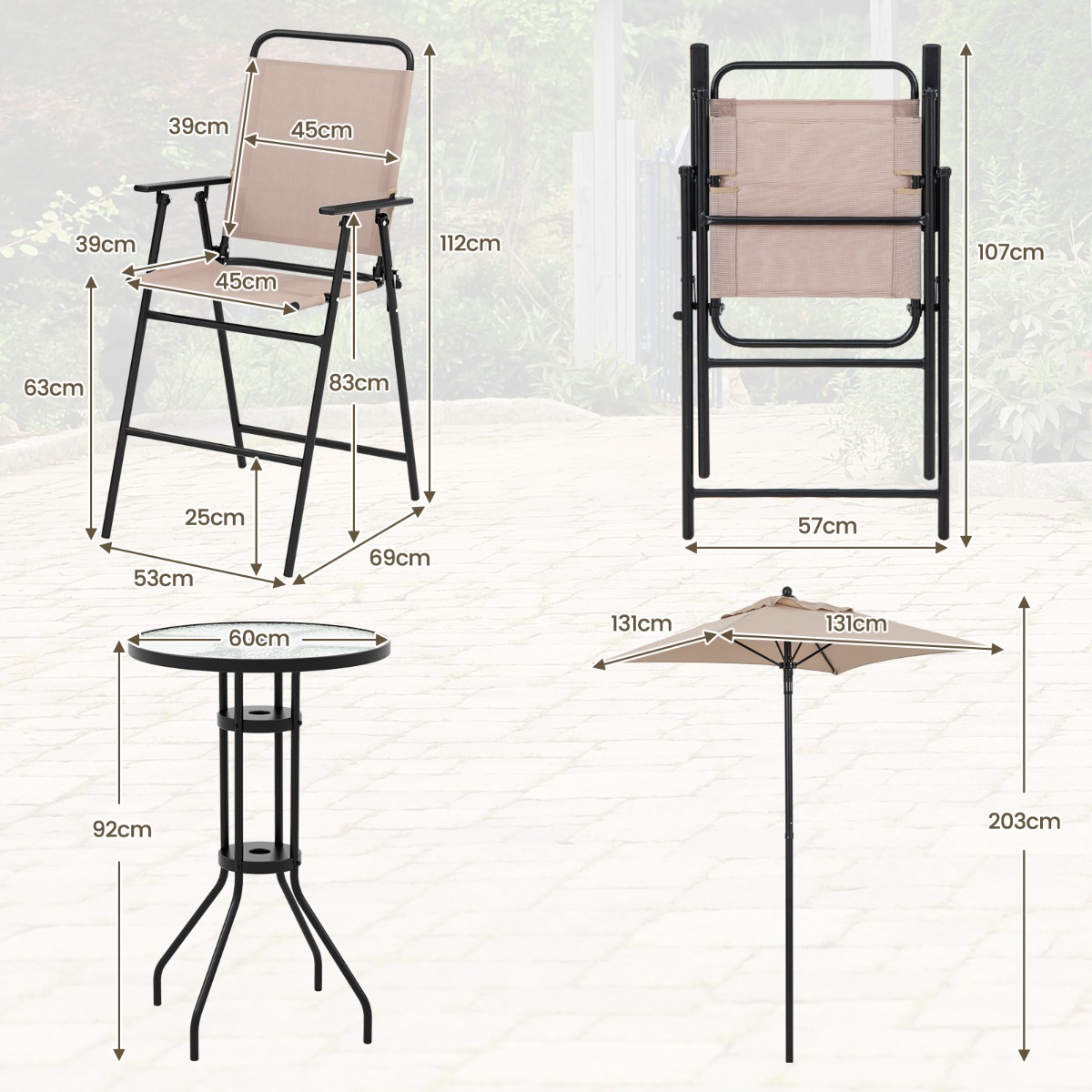 Verbeter je buitenruimte moeiteloos met onze uitgebreide terrasmeubelset. Met een vierkante parasol die je beschermt tegen de genadeloze zon en tegelijkertijd verfrissende briesjes doorlaat, is het een echte zomerse must-have. En dat is niet alles: onze innovatieve inklapbare barkrukken maximaliseren het ruimteverbruik, zonder een vleugje comfort op te offeren, dankzij hun ergonomische design. Ondertussen is de bedekte stof ademend, sneldrogend, kleurecht en zonbestendig, wat langdurig comfort en duurzaamheid garandeert. Attributen: Buitengewoon comfort: De outdoor patio-meubelset wordt geleverd met een vierkante parasol van 131 x 131 cm, die ideale bescherming tegen de brandende zon biedt. Tegelijkertijd bevordert het geventileerde dak met 2 niveaus de luchtcirculatie en zorgt het voor een koele sfeer. Inklapbare barkrukken: De balkonset bevat 2 inklapbare barkrukken, die ruimte besparen als ze niet in gebruik zijn. Vergeet niet om het frame met de veiligheidsgesp te fixeren. Bovendien biedt de ergonomische stoel met geïntegreerde armleuningen en comfortabele voetensteun echte ontspanning. Weerbestendig materiaal en robuuste constructie: De 4-delige terrasset met parasol bestaat uit all-weather en robuust metaal, die voor gebruik buitenshuis zijn gebouwd en de elementen weerstaan om langdurig gebruik en het hele jaar door comfort te garanderen. Veelzijdige en functionele set: Of je nu een kleine bijeenkomst organiseert of gewoon bij een goed boek ontspant, de outdoor-tafelset biedt veelzijdige zitmogelijkheden en maakt het mogelijk om de perfecte outdoor-oase voor elke gelegenheid te creëren. Eenvoudig te monteren en te onderhouden: Met een probleemloos montageproces kan deze terrasset in enkele minuten worden opgebouwd. Bovendien geeft de gestructureerde, hoogwaardige geharde glasplaat van de bartafel een moderne elegantie en maakt een eenvoudige reiniging mogelijk. Kenmerken: Met geventileerd, waterdicht en zonwerend zonnescherm om te genieten van het buitenleven Afneembaar zonnescherm dat in het geïntegreerde parasolgat past en afzonderlijk kan worden gebruikt Hoge bartafel met 2 beugels om de parasol op zijn plaats te houden Stevig metalen frame met antislipvoetjes voorkomt uitglijden en krassen op de vloer Rond blad van gehard glas is duurzaam en gemakkelijk schoon te maken Opvouwbare stoel voor ruimtebesparend opbergen buiten het seizoen Ergonomisch ontworpen voor maximaal comfort Sneldrogende, kleurbestendige stof voor eenvoudig onderhoud