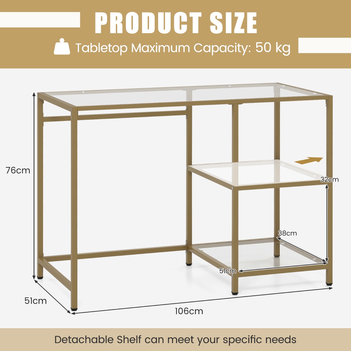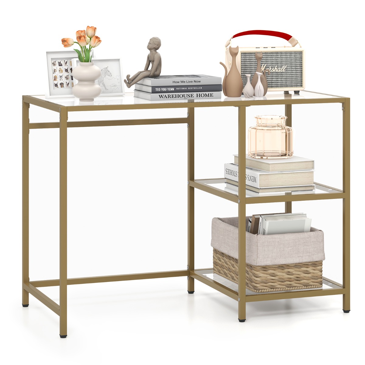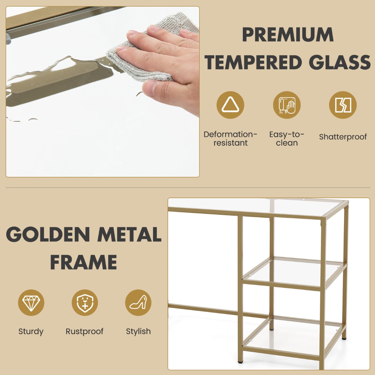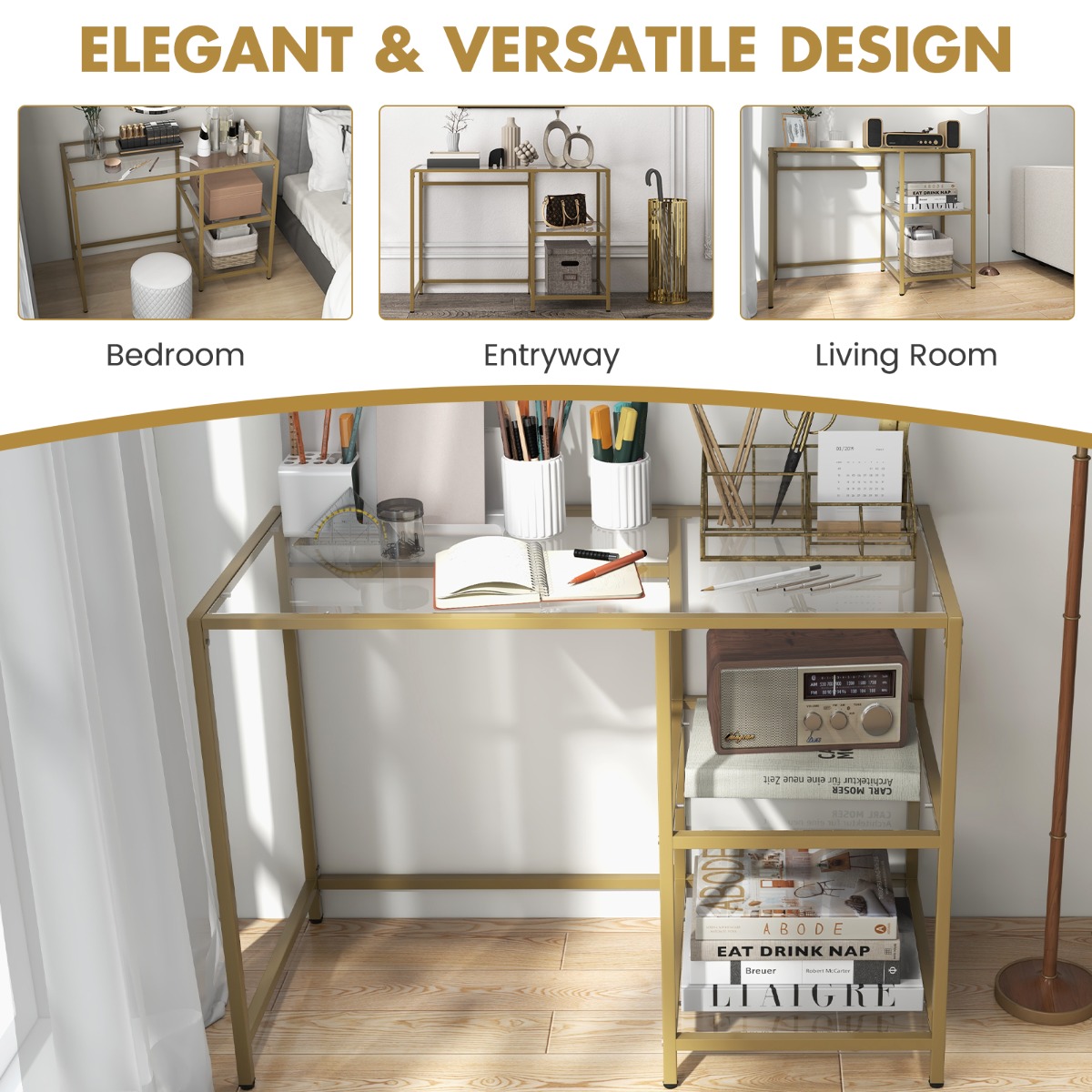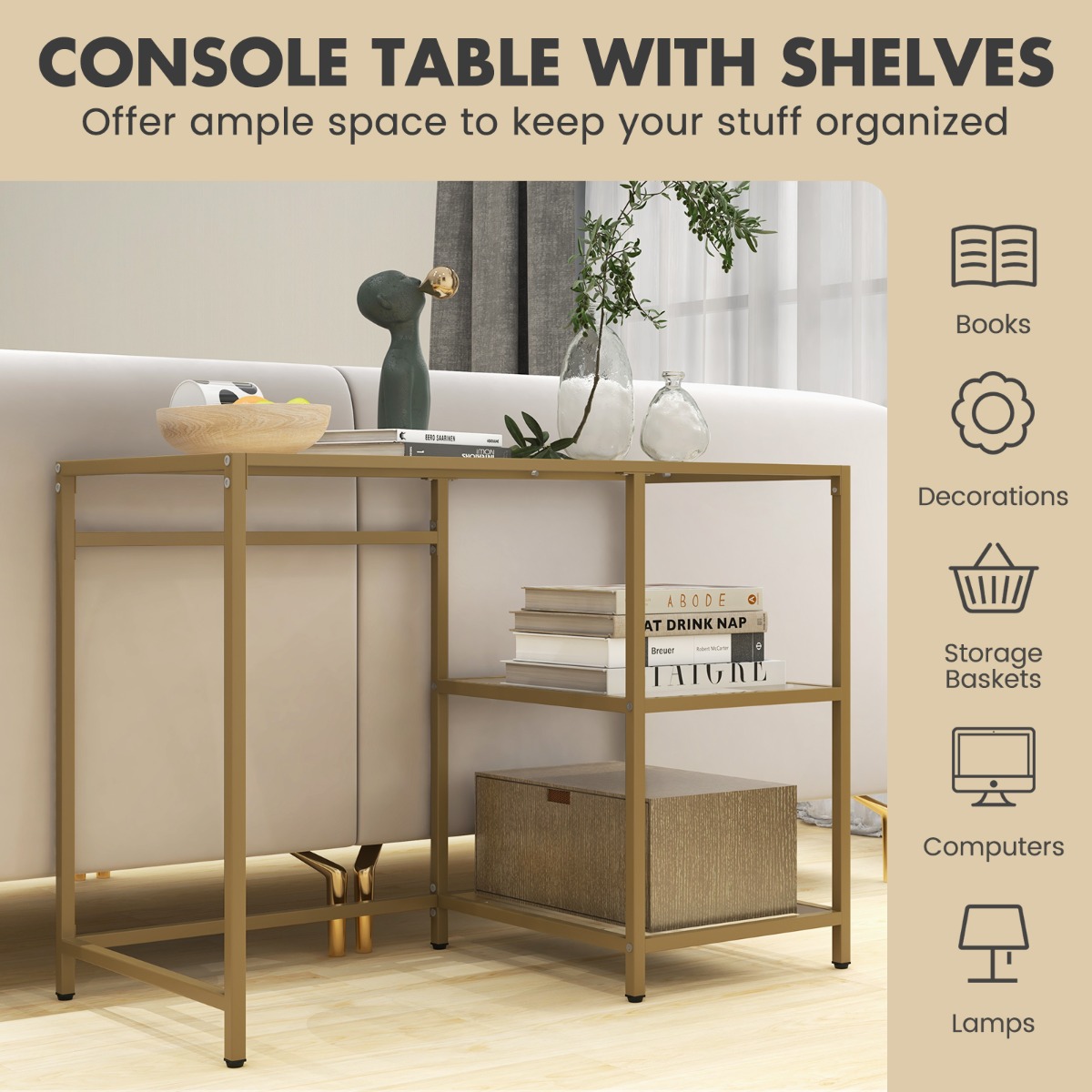 De consoletafel met planken en groot tafelblad biedt voldoende ruimte voor de presentatie van je potplanten, decoraties en handwerk. Het gouden metalen frame combineert duurzaamheid en esthetiek perfect en zorgt voor een stabiele structuur en een modieuze uitstraling. Bovendien is het geharde glas onbreekbaar en vervormingsbestendig. Dankzij zijn moderne uitstraling en het smalle design past de consoletafel perfect in je woonkamer, entree, slaapkamer enz. De tafel kan gemakkelijk met een doek worden gereinigd en de montage is dankzij de gedetailleerde handleiding eenvoudig. Attributen: Grote tentoonstellingsruimte: Ontworpen met een ruim tafelblad en 2 open planken, biedt onze glazen consoletafel voldoende ruimte om je spullen georganiseerd te houden. Zo kun je je boeken, opbergmanden, kleinigheden, dranken en lampen presenteren. Daardoor wordt je kamer opgeruimd. Superieure duurzaamheid: Gemaakt van gehard glas biedt de consoletafel buitengewone sterkte, waardoor hij onbreekbaar en bestand is tegen vervorming. Ondersteund door een roestbestendig metalen frame is de gangtafel duurzaam. Bovendien beschermen verstelbare antislip voetkussens de vloer en verhogen de stabiliteit. Elegant en ruimtebesparend design: Met aantrekkelijk goudkleurig frame zal de glazen ingangstafel een vleugje luxe in je kamer brengen en hem tot een verbazingwekkende decoratie maken. Bovendien maakt het slimme smalle design optimaal gebruik van de ruimte, wat perfect is voor hal, entree of slaapkamer. Veelzijdige toepassingen: De entreetafel combineert functionaliteit en esthetiek. Daarom dient de glazen console-tafel niet alleen als consoletafel, maar ook als opbergrek in je hal, als bijzettafel naast de bank of als plantenstandaard op het balkon. Gemakkelijk te reinigen en te monteren: De salontafel kan gemakkelijk met een zachte doek worden gereinigd, wat het onderhoud vergemakkelijkt. Daarnaast wordt hij geleverd met een gedetailleerde handleiding (mogelijk niet beschikbaar in het Nederlands) voor een eenvoudige montage, zodat je in korte tijd van je nieuwe consoletafel kunt genieten. Kenmerken: 2 open planken en een breed tafelblad bieden voldoende ruimte Hoogwaardig gehard glas is robuust en onbreekbaar Metalen frame met T-vormige verbinding en roestbestendige eigenschap De beschermende glazen plank houdt de glasplaat op zijn plaats Verstelbare voetkussens helpen om op verschillende vloeren stabiel te staan Het afneembare rek kan aan je specifieke behoeften voldoen Het gemakkelijk te reinigen oppervlak vereenvoudigt het schoonmaken Gouden frame en transparant glas voor een stijlvolle uitstraling