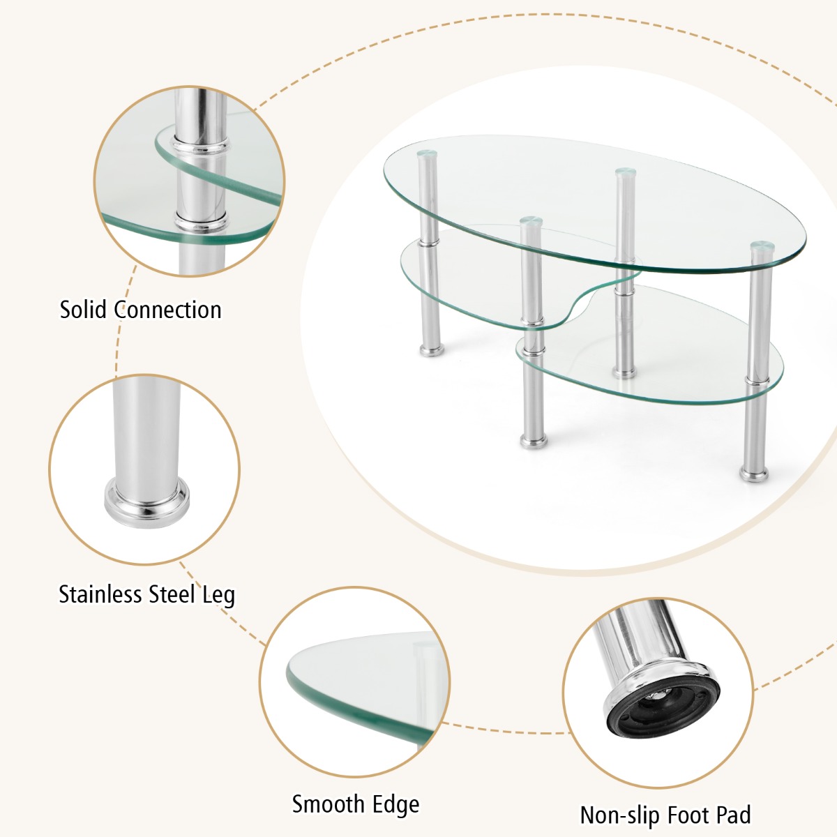 Deze glazen tafel is geconstrueerd met de beste kwaliteitsmaterialen zoals gehard glas en staal. De unieke mix van metaal en glas transformeert dit kunstwerk in een moderne theetafel. Het ovale bureaublad en de gebogen onderplanken verhogen de aantrekkelijkheid van deze tafel en maken hem tot het middelpunt van de belangstelling in uw woonkamer. Ook deze salontafel heeft een hoge gebruikswaarde. Het ruime tafelblad en de open opberg vakken maken uw spullen op orde. Bovendien zorgen dikke glazen schappen en een stevige verbinding voor de stabiliteit en de belastbaarheid van de tafel. Attributen: 【3-laags ontwerp & Open opslag】Onze glazen tafel wordt geleverd met 2 onderste planken en een ruim tafelblad om u een grote opslagcapaciteit en een plaats voor handige spullen te bieden. En de open opbergrekken kunnen de spullen op volgorde en gemakkelijk mee te nemen indelen. 【Stevig frame & Duurzaam materiaal】Onze salontafel is gemaakt van gehard glas, hoogwaardig staal en hoogwaardig beslag en heeft een grote stabiliteit, slijtvastheid en belastbaarheid. Plus verwijde pootdoppen, kan deze tafel u een ultra stevig frame bieden dat voorkomt dat u gaat schudden. 【Stijlvolle uitstraling & Uniek ontwerp】Onze unieke salontafel is voorzien van een ovaal glazen blad en onregelmatig gevormde schappen en ziet er modern en stijlvol uit. De kenmerkende gebogen lijnen verhogen de visuele aantrekkingskracht. Bovendien zorgt de niet-hoekige rand voor een betrouwbare en veilige ervaring. 【Eenvoudig onderhoud & Snelle installatie】Deze tafel komt bij u aan de deur en bevat alle onderdelen met een goed geïllustreerde gebruikershandleiding, zodat u alle genummerde accessoires snel kunt installeren als u de instructie zorgvuldig volgt. Bovendien is het dagelijkse onderhoud gemakkelijk te reinigen met een natte handdoek, aangezien het gladde glazen oppervlak en de metalen poten van de tafel glad zijn. 【Brede toepassing】Transparant glas en zilverkleurig metaal kunnen uw decor in evenwicht brengen en u deze minimalistische salontafel geven. En zijn compacte afmetingen en geschikte hoogte passen perfect in uw woonkamer of receptie kamer om u een geweldige plek te bieden om te genieten van uw vrije tijd en uw vergaderingstijd. Kenmerken: 3-laags ontwerp zorgt voor grote opbergcapaciteit en scheidingswand plaats Gehard glas & premium staal zorgen voor een groot draagvermogen De verwijd metalen pootdoppen maken het frame stevig en stabiel Open opbergvorm maakt het in- en uitnemen gemakkelijk Gladde oppervlakte gebruik maken van het dagelijkse onderhoud Ovaal tafelblad met gebogen onderplanken heeft een brede toepassing Stijlvolle uitstraling verhoogt de visuele aantrekkelijkheid