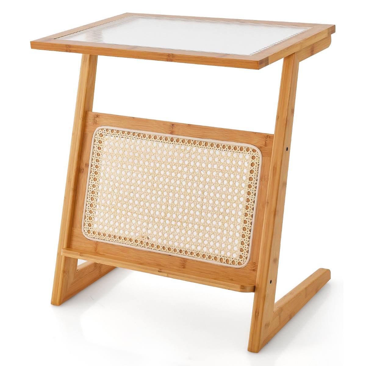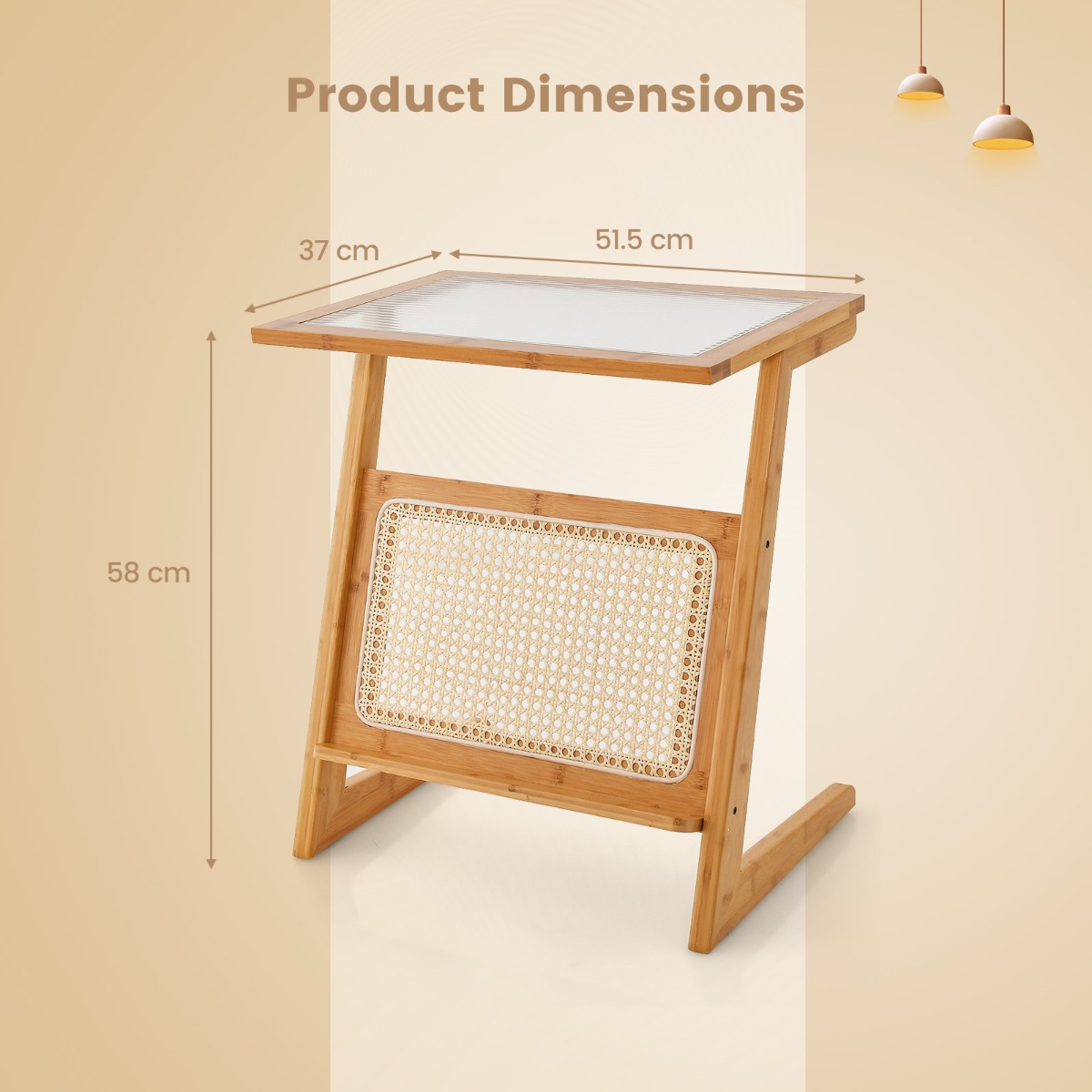 Deze kleine boho bijzettafel zal een uitstekende aanvulling zijn op je woonkamer! Met zijn compacte formaat en een onderstel dat onder de bank kan worden weggestopt, biedt onze bijzettafel voor de bank functionaliteit zonder al te veel ruimte in beslag te nemen. Meer details tonen het uitstekende vakmanschap, onze bijzettafel heeft bijvoorbeeld een glazen blad en een rotan plank voor koffiekopjes, afstandsbedieningen, boeken of tijdschriften. De hoogwaardige materialen garanderen een lange levensduur. De robuuste bamboe constructie en antislip voetzolen zorgen voor extra stabiliteit. Deze veelzijdige bijzettafel is geschikt voor elke omgeving: woonkamer, slaapkamer, studeerkamer of entree. Attributen: 【Geniek Z-vormig ontwerp】Onze Z-vormige bijzettafel heeft een compact formaat waardoor je het onderste deel van de tafel onder je bank of bed kunt schuiven om ruimte te besparen. Bovendien heeft de voorkant van de Z-vormige bijzettafel een rotan plank om je tijdschriften bij de hand te houden. 【Uniek glazen blad】Deze bijzettafel heeft een transparant glazen blad dat extreem duurzaam is. Het unieke glas geeft je interieur een elegante en mysterieuze uitstraling. Het tafelblad is niet alleen glad en waterdicht, maar ook afneembaar, waardoor het gemakkelijk schoon te maken is. 【Robuuste constructie】Vergeleken met de C-vormige bijzettafel is de Z-vormige bijzettafel stabieler. De bijzettafel van bamboe is niet alleen geurloos, maar ook zeer duurzaam en perfect voor langdurig gebruik. Bovendien heeft de bijzettafel 4 antislip voetkussentjes voor extra stabiliteit. 【Geschikt voor meerdere scenario’s】Deze tafel kan gebruikt worden als bijzettafel in de woonkamer, als laptoptafel in de studeerkamer of als nachtkastje in de slaapkamer. De elegante bijzettafel van bamboe met eenvoudige lijnen is een perfecte aanvulling op een zithoek of kantoorruimte. 【Makkelijk in elkaar te zetten】De totale afmeting van de bijzettafel is 51,5 x 37 x 58 cm (L x B x H). Je kunt er gemakkelijk je afstandsbediening, iPad, laptop en nog veel meer op kwijt. Instructies en alle benodigde accessoires worden meegeleverd, zodat je het in een handomdraai in elkaar kunt zetten. Kenmerken: Ruimtebesparende Z-vormige bijzettafel voor kleine ruimtes Bijzettafel heeft een rotan plank voor tijdschriften Uniek glazen blad geeft deze bijzettafel een elegante uitstraling en brengt schoonheid in je huis Onze bijzettafel heeft een waterbestendig oppervlak voor eenvoudig schoonmaken Gemaakt van hoogwaardig bamboe, geurvrij en geschikt voor langdurig gebruik Sterke verbindingen en 4 antislip voetkussentjes voor extra stabiliteit Veelzijdige bijzettafel: kan worden gebruikt als nachtkastje, snacktafel of banktafel, enz. Ontworpen voor eenvoudige installatie met gedetailleerde instructies