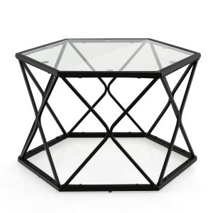 Costway Geometrisch Glas Salontafel Hexagonale Eindtafel met Gehard Glas Bovenkant & Metalen Poten Moderne Accent Salontafel Zwart