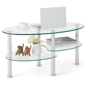 Costway Salontafel van Gehard Glas 3-Draads Moderne Ovale Theetafel met Ruim Glazen Blad Moderne Gladde Glazen Tafel Bijzettafel 89 x 50 x 45 cm