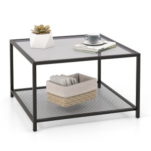 Costway Centrale Salontafel met 2 Etages Rechthoekige Bijzettafel met Legplank Blad van Gehard Glas en Metalen Onderstel 95 kg Draagvermogen