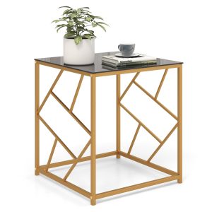 Costway Moderne Vierkante Bijzettafel met Gehard Glazen Blad en Verguld Geometrisch Frame Chique Nachtkastje Zwart en Goud